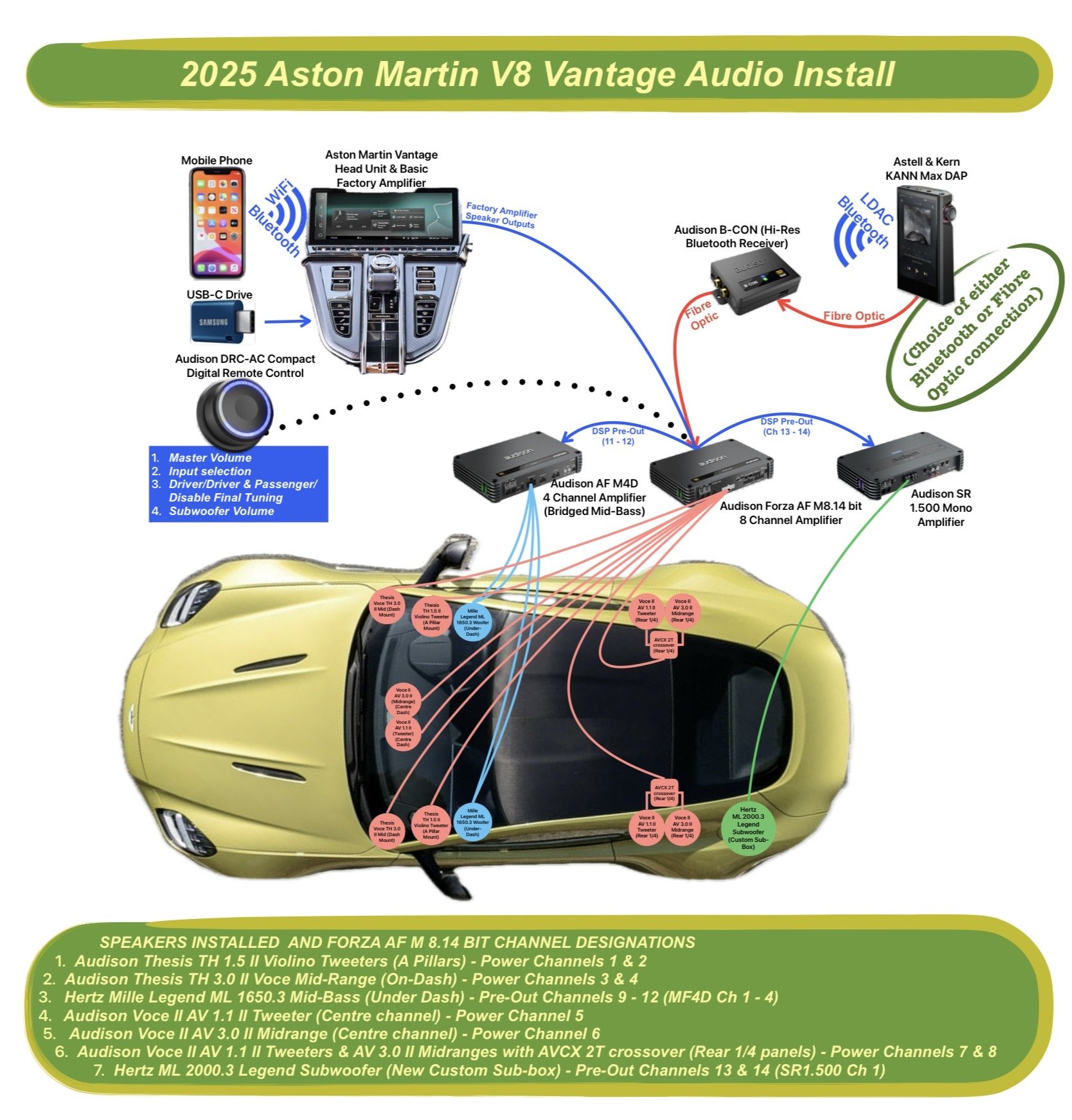 Whist many Aston owners will eschew any type of audio upgrades in their car (stating that listening to the V8 AMG engine should be sufficient) my advice for music lovers and audiophiles is to save £7,000 by not ticking the ‘Bowers & Wilkins Premium Audio’ options box, and instead spend the money at a reputable after-market audio installer having a bespoke (designed specifically to your taste) system installed. Here is a diagram of the after-market audio system installed in my 2025 Vantage (Dan, Fuel the Passion, may share further details of this in an upcoming FTP blog after my car has featured in Volume 14 of ‘Driving Sounds’ Magazine);