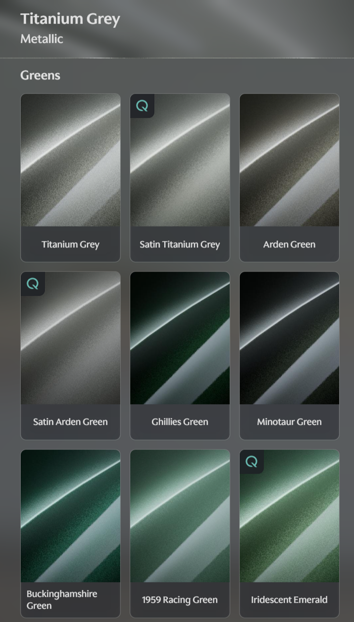 For example, my final chosen colour (Titanium Grey) isn’t grey at all - rather a sandy, golden colour with a definite green fleck/hue with a deep sparkle, and is listed on the DVLA log book as ‘Green’!